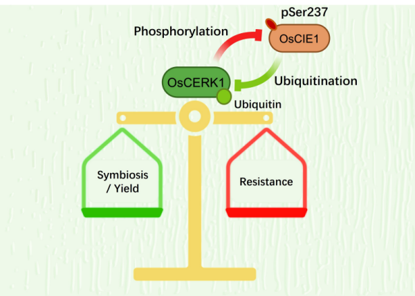 促进水稻营养吸收和生长的丛枝菌根真菌与对水稻造成毁灭性病害的稻瘟病菌均属于真菌。它们的细胞表面均覆盖着名为几丁质的多聚糖类物质。那么,植物如何区分“有益”和“有害”微生物?原来是“长短有别”:短链几丁质可以作为共生信号,而长链几丁质则会触发植物的抗病免疫反应。在建立互惠互利共生关系时,共生菌根真菌会释放大量短链几丁质作为信号,通知植物为建立共生关系做准备。而病原菌则会避免几丁质分子的“泄漏”,尤其是长链几丁质,以免被植物识别并激活免疫反应。水稻细胞表面的关键受体蛋白OsCERK1能够辨别免疫信号或共生信号,特异介导植物的免疫或共生反应。然而,这需要一定的监管。若受体OsCERK1触发的免疫反应失控,将引发过度的免疫反应。这虽然对病原体抵抗增强,但阻碍了植物生长和与互惠菌根共生的建立。关于水稻体内如何有效调控这种潜在的过度激活的免疫反应,一直是尚待揭晓的谜团。