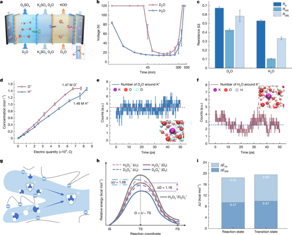 该研究阐明了双极膜高效解离重水的核心机理。在反向偏压作用下,双极膜中间层离子定向迁出,解离产生的氘离子和氘氧根离子成为氘代酸碱的来源。研究发现,重水体系中更高的氘氧键键能和更低的离子扩散系数共同导致双极膜电渗析膜堆电压显著升高。同时,更高的双极膜极限电流密度和溶液电阻使得重水解离达到稳态所需时间远长于普通水解离。分析表明,重水体系下双极膜中间层解离电阻、膜层传质电阻及扩散边界层电阻均显著高于水体系。在消耗相同电荷量的情况下,氘离子/氘氧根离子的生成速率反而是氢离子/氢氧根离子的1.25倍,这颠覆了关于重水产酸碱速率的固有认知。分子动力学模拟发现,重水更高的粘度和更强的氢键网络增加了阳离子如钾离子的迁移阻力,使其溶剂化壳层更稳定有序;氘离子和质子在膜相内迁移能力存在差异。第一性原理计算证实,膜相内氘离子团簇具有比质子团簇更低的脱水能垒,导致其迁移速率差异近7倍。这表明,离子在膜相内的快速有序扩散强化了双极膜中间层的解离效率。