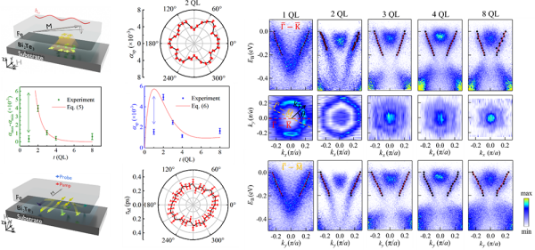 实验上,研究团队利用超高真空分子束外延技术制备了高质量、厚度精确可控的Bi2Te3超薄膜。通过角分辨光电子能谱测量不同厚度Bi2Te3的费米面,拟合出能带弯曲效应随厚度的变化规律。进一步构建Fe/Bi2Te3?异质结后,结合平面波导铁磁共振测试系统和时间分辨磁光克尔效应测试平台,分别在纳秒与飞秒时间尺度探究其自旋动力学。实验结果与理论预测一致:在纳秒尺度观察到各向异性增强的Gilbert阻尼,且其各向异性程度随Bi2Te3层厚度增加呈现先增后减的趋势;而在飞秒尺度下,则检测到近乎各向同性的超快退磁过程。