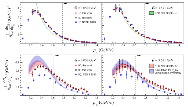 面对这一挑战,团队利用BESIII能量扫描数据,精确测量了带电pion和Kaon介子的单举产生微分截面,最高精度达1%~2%。结合NPC合作组(Non-perturbative Physics Collaboration)的全局数据拟合研究,这一新的测量结果与基于次次领头阶精度的QCD理论分析相符合,尤其是大动量强子区域。该研究成果为检验低能区QCD因子化定理及部分子碎裂过程中同位旋对称性的有效性提供了有力的实验支持,对深入理解强相互作用动力学具有重要意义。