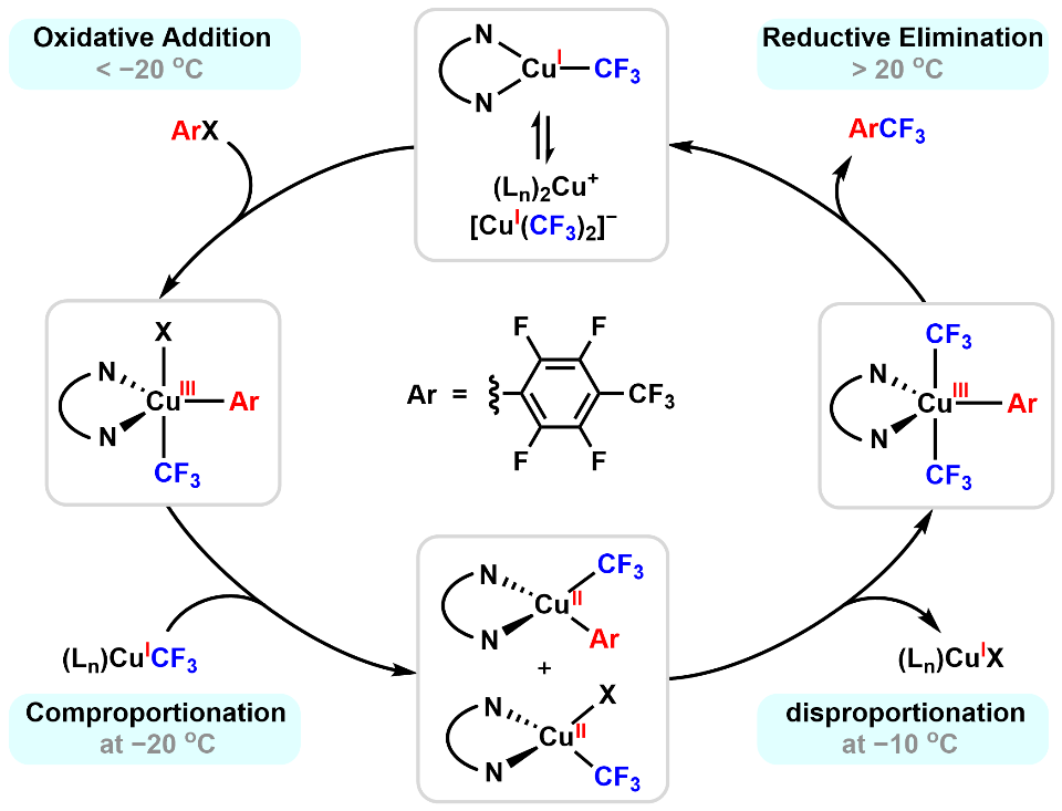 科研团队通过温度调控三氟甲基铜(I)络合物和缺电子芳基碘化物的反应进程,揭示了反应中铜物种复杂的氧化还原行为。团队发现,反应在?20℃下即会发生氧化加成和归中反应,得到铜(II)物种;二价铜物种在?10 ℃下发生歧化反应,得到铜(III)物种和铜(I)物种;铜(III)物种在接近室温下发生还原消除,重生铜(I)物种,完成整个氧化还原循环。上述过程得到核磁共振、电子顺磁共振和紫外-可见吸收光谱的多谱学交叉验证。更重要的是,在多种缺电子芳基碘化物的三氟甲基化反应和乌尔曼联苯合成反应中,类似的反应行为均被观测到,说明其可能普遍存在于多种类型的乌尔曼偶联反应中。