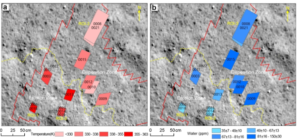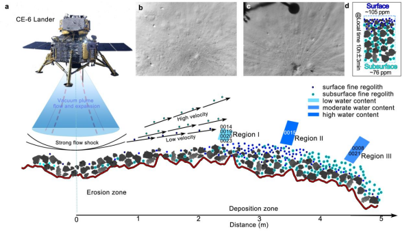 为解释上述现象,研究团队提出了月面双层水含量分布模型。由于月球无大气,其表面细粒风化层具有很好的绝热性,使月表以下的次表层存在明显的热梯度,即从表面至~1cm深度,月壤温度下降~30k至50K。同时,细粒月壤较粗粒月壤具有更高的面积体积比,因而太阳风注入形成水的效率更高,使细粒月壤具有更高的水含量。着陆器在下降过程中,羽流侵蚀陆区最上层的细粒成熟月壤,向各个方向吹扫,并在着陆区形成中心侵蚀区和四周沉积区。随着着陆器不断下降,羽流继续从更深的次表层吹出细粒月壤。